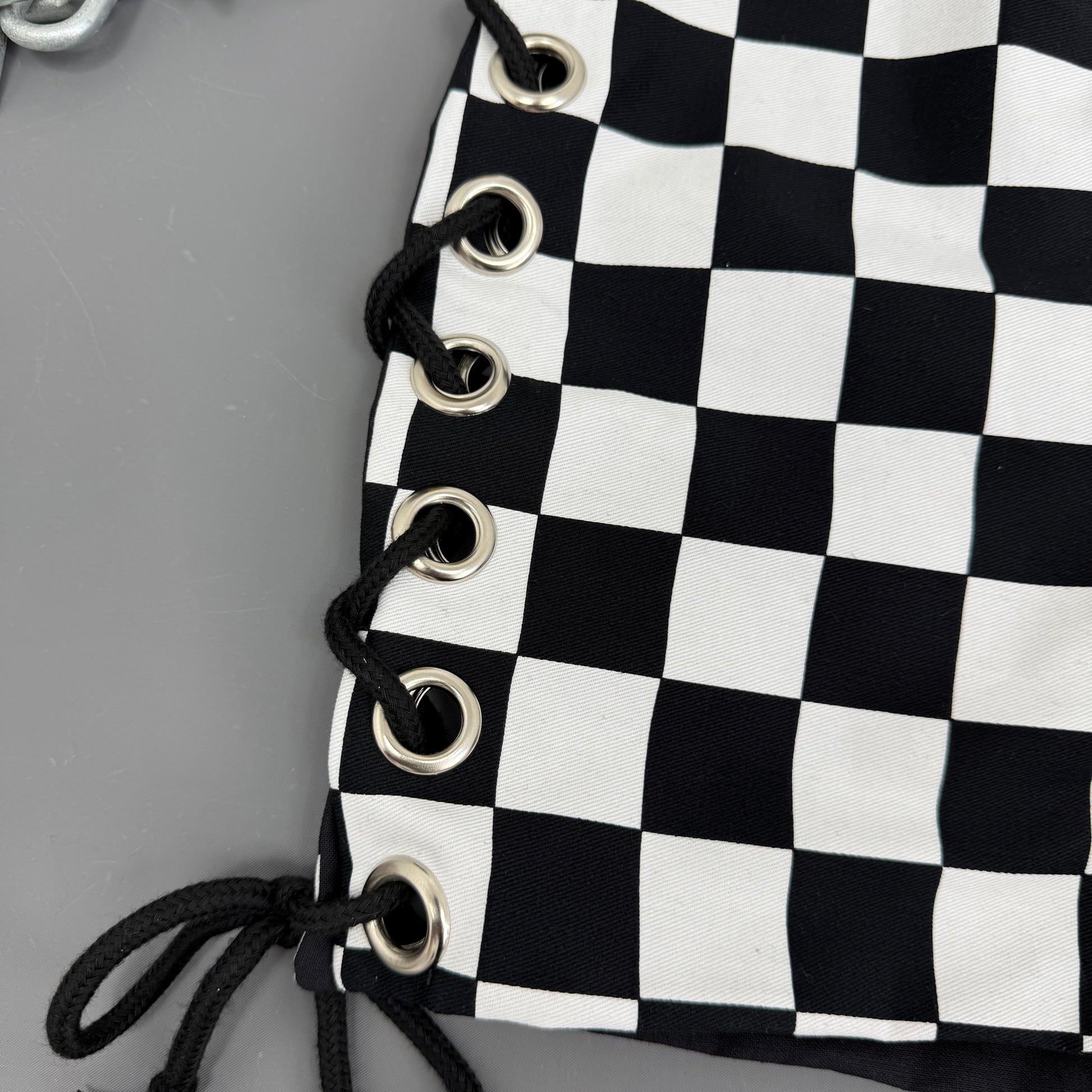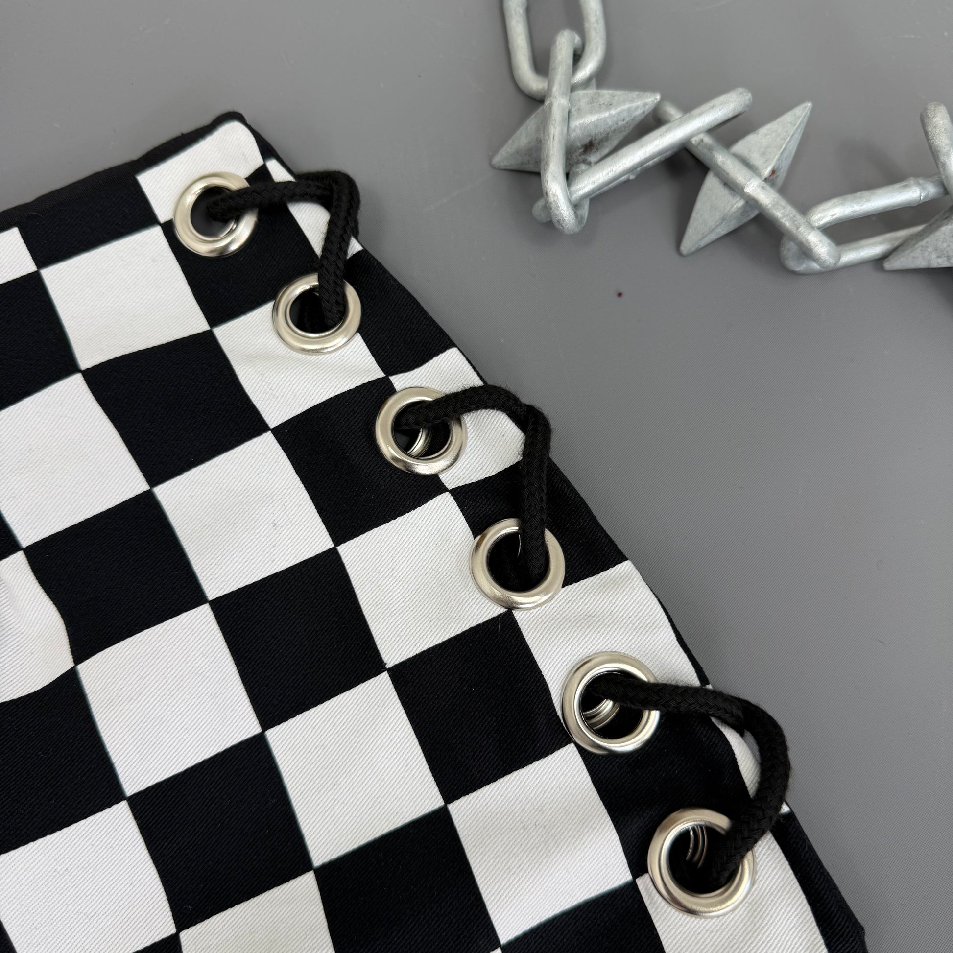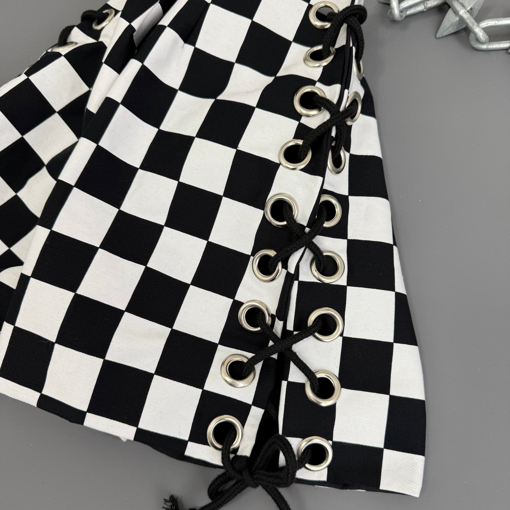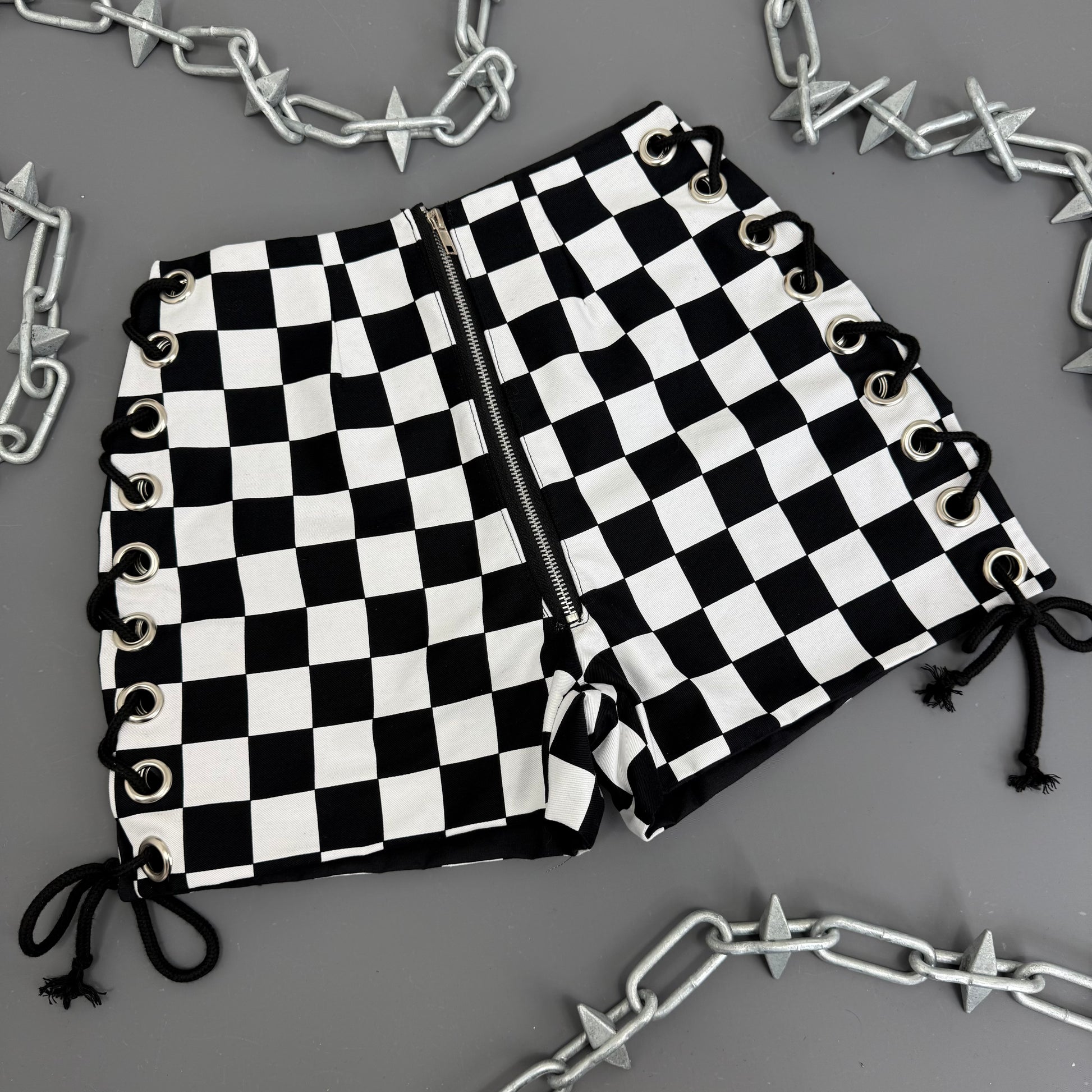 High waisted cotton checkerboard shorts with metal zip and lace up sides.